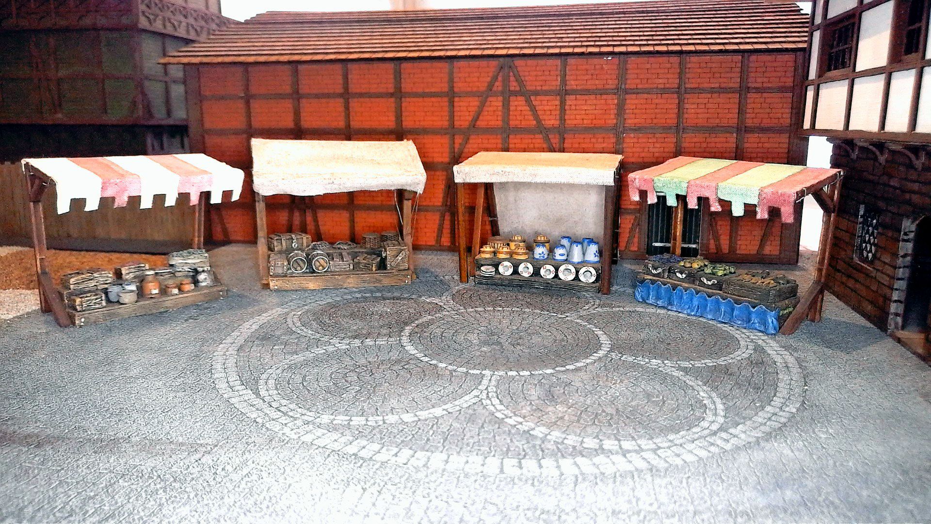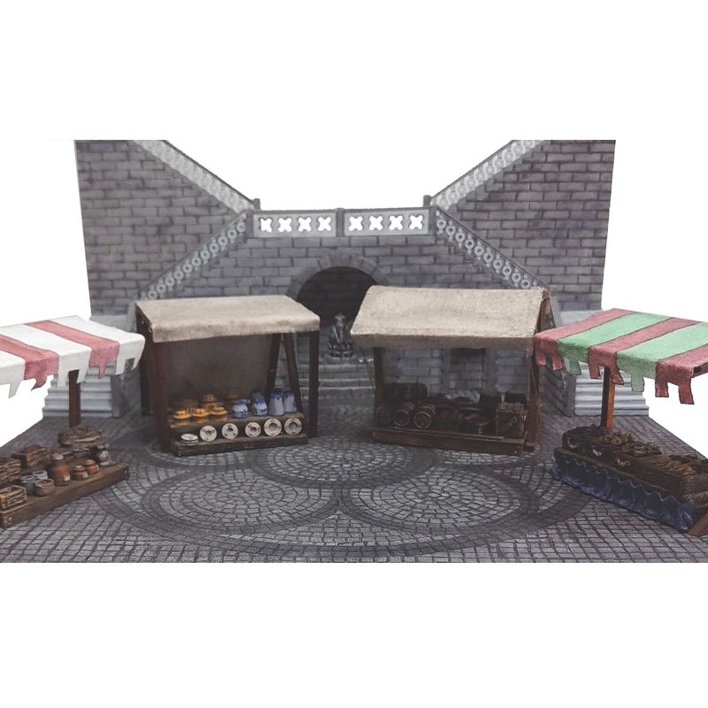 Was wäre eine mittelalterliche Stadtszene ohne einen Marktplatz. Nicht nur optisch wird so dem Ganzen Leben eingehaucht, denn die Helden der Geschichte können sich hier mit allerlei Gütern eindecken. Es gibt mehrere verschiedene Marktstände im Sortiment, sowie ein Set mit vier Holzgestellen, auf denen man dann eine Plane anbringen kann. Die Marktstände eignen sich gut zum Einsatz in Tabletop- und Skirmish-Spielen der Genres historisch und Fantasy.